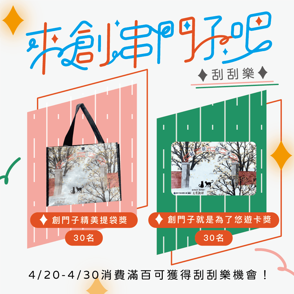 此外,活動另一大主軸「創串門子刮刮樂」則推出限量手繪悠遊卡及提袋各30份,民眾於4月20日至4月30日每日下午5時前,在光復新村及審計新村摘星基地消費,單店單筆滿百,即可於店家手機掃描QRcode現場線上刮刮樂一次,有機會刮中限量悠遊卡及提袋!