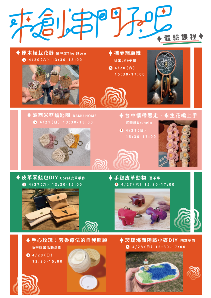 勞工局說明,「來創串門子吧!」活動第一主軸為「我是小小工藝家」,分為「質感品味之路」、「編織生活之路」、「皮革創意之路」、「療癒手作之路」四大主題,邀請審計新村青創基地店家貳囍樓及光復新村憶呷店、日常Life手屋、DAMU HOME、CORAL皮革手作、吾革事、沁季娛樂活動企劃、陶慈多肉8位摘星品牌主理人,分別於4月20、21、27、28日與民眾分享創業歷程,並帶來木器、編織、皮革、香氛、陶藝等有趣好玩的工藝手作體驗,邀請民眾親自體驗動手做的樂趣!