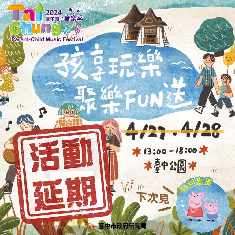 2024台中親子音樂季原訂本週末4月27、28日舉行,考量中央氣象署預報週末將有鋒面通過,雷陣雨發生機率高,為保護民眾安全,台中市政府新聞局今(25)日宣布活動延期辦理,後續舉辦日期將另行公告。