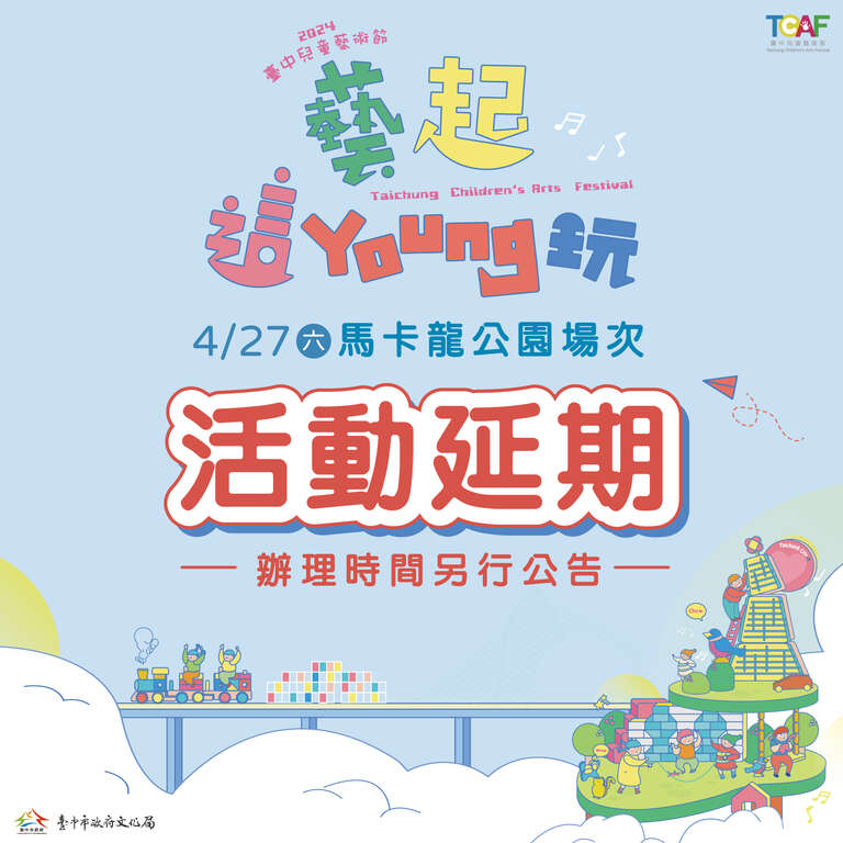 2024台中兒童藝術節馬卡龍公園場次原訂這週末4月27日舉行,考量中央氣象署預報週末將有鋒面通過,雷陣雨發生機率高,為保護民眾安全,台中市政府文化局今(26)日宣布活動延期辦理,後續舉辦日期將另行公告。