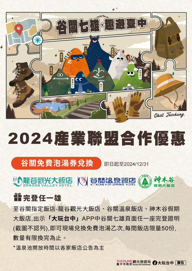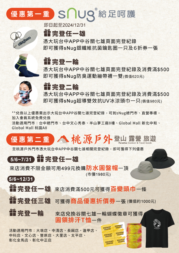 觀旅局補充,每年山友們期待的產業聯盟合作優惠,今年也持續進行,即日起民眾可憑大玩台中APP中的谷關七雄完登紀錄至合作店家兌換相關優惠產品。此次合作的店家有戶外用品專賣店-桃源戶外、機能襪專賣-sNug給足呵護、谷關知名溫泉飯店-谷關溫泉飯店、神木谷假期大飯店、龍谷觀光大飯店,各店家依不同的完登任務提供多項兌換優惠,除大台中地區,部分品牌門市更擴及彰化、南投、新北、桃園地區,歡迎民眾踴躍參與,因各店家合作內容及活動起始時間皆不同,詳細活動內容及兌換條件請上「谷關七雄,趣遊臺中」活動官網查詢(https://travel.taichung.gov.tw/zh-tw/event/activitydetail/8831)。