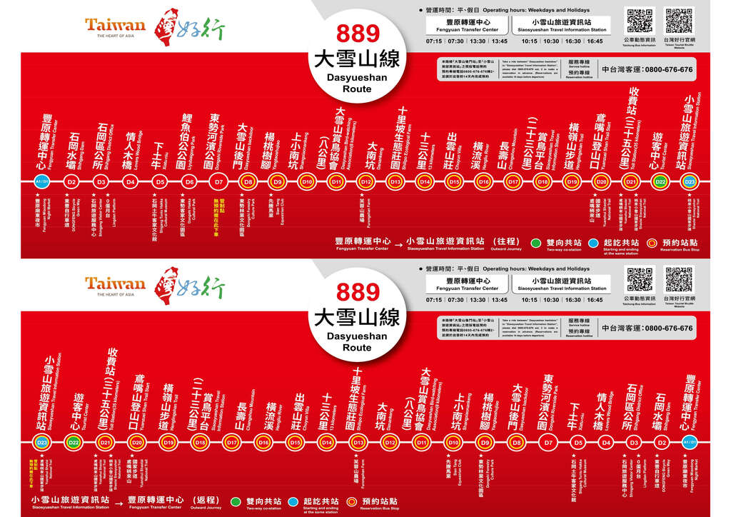 葉局長進一步表示,889路台灣好行大雪山線從豐原轉運中心發車,因應觀光路線需求,每日營運8班次,採跳蛙式停靠觀光景點鄰近公車站,以便利旅客快速串遊。囿於大雪山林道路段行駛車種限制,路線採用乙類大客車營運,並在部分車輛加裝油壓升降機提供無障礙服務,因乘載座位數有限,中台灣客運提供座位預約機制,以便利旅客遊程安排,預約乘車請逕洽中台灣客運客服電話(0800-676-676)。