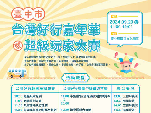 台灣好行11台中時尚城中城線誠徵超級玩家!台中市政府觀光旅遊局將於9月29日在台中驛鐵道文化園區舉辦「台中台灣好行嘉年華活動暨超級玩家大賽」,邀請各路好手運用「台灣好行11台中時尚城中城線」完成大會指定任務。活動開放線上報名50組、當天現場服務台報名10組,報名期限自即日起至9月26日23時59分止,每組限2人,不限年齡,額滿為止,得獎者最高可獲得6000元台中台灣好行購物金及其他好禮。所有完賽參賽者還能獲得抽獎機會,獎品包含台中至越南來回機票、台中飯店住宿券、台中伴手禮及登機箱等大獎,歡迎國內外旅客踴躍報名。