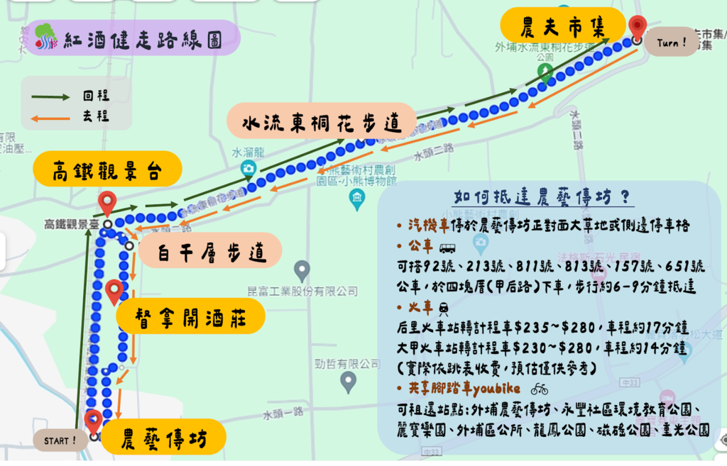 六分農藝傳坊→高鐵觀景台0.6K→桐花步道1.0K→永豐農夫市集桐花步道2.1K→白千層步道3.7K→督拿開酒莊3.9K→六分農藝傳坊4.1K