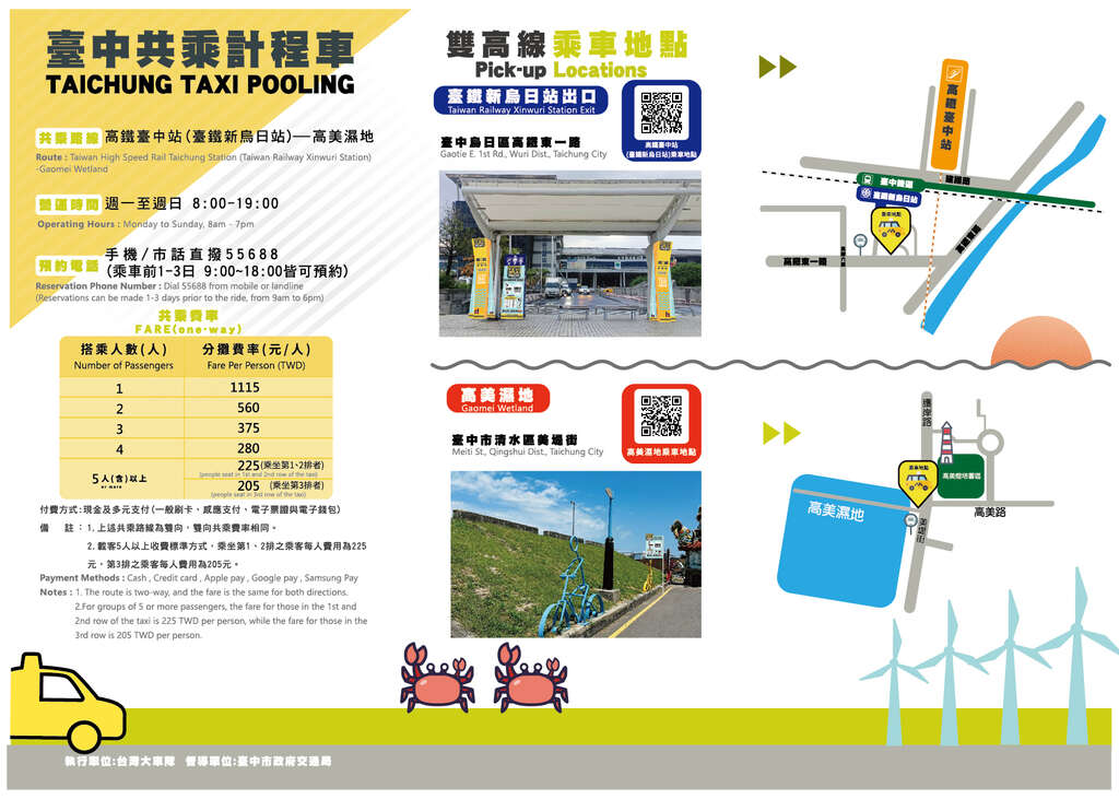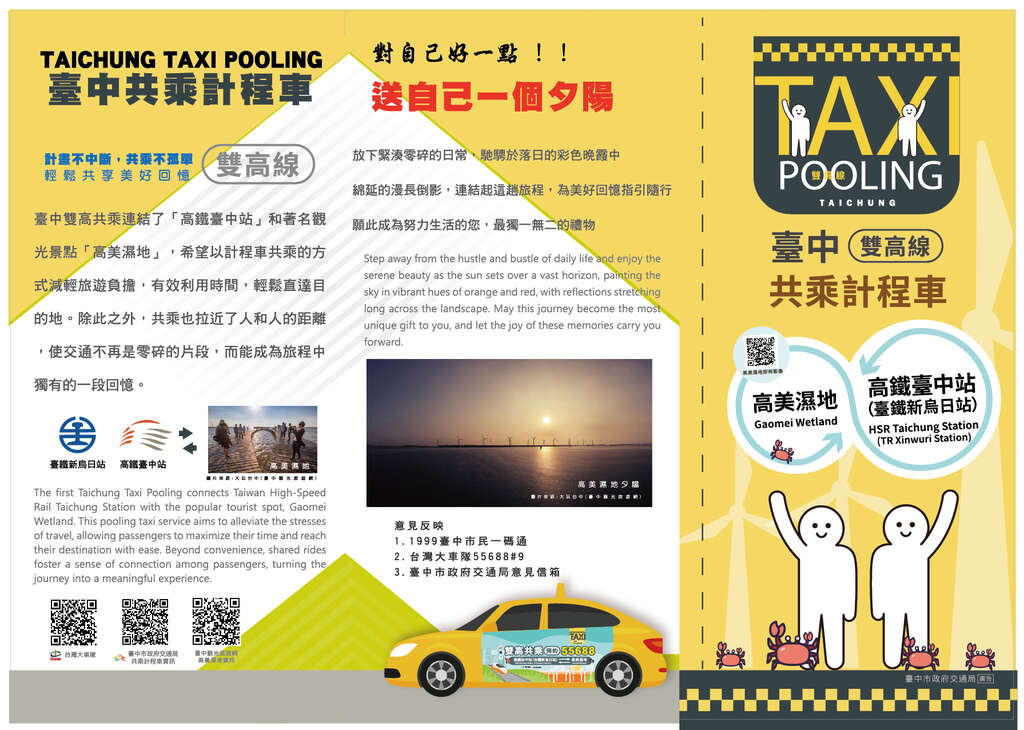 台中市政府為響應節能減碳政策,推動首條共乘計程車路線,今(9)日歡喜上路,連結高鐵台中站(台鐵新烏日站)與高美濕地,來往「雙高」時間自由選,不用受限公共運輸班次,遊客到有「此生必遊景點」美譽的高美濕地,交通方式增加彈性選擇,期待吸引更多國內外遊客,感受台版「天空之鏡」的夕陽餘暉與豐富生態。交通局長葉昭甫表示,共乘模式降低乘客外出成本、免去轉乘,也有機會結識新朋友,增加旅程中的樂趣。