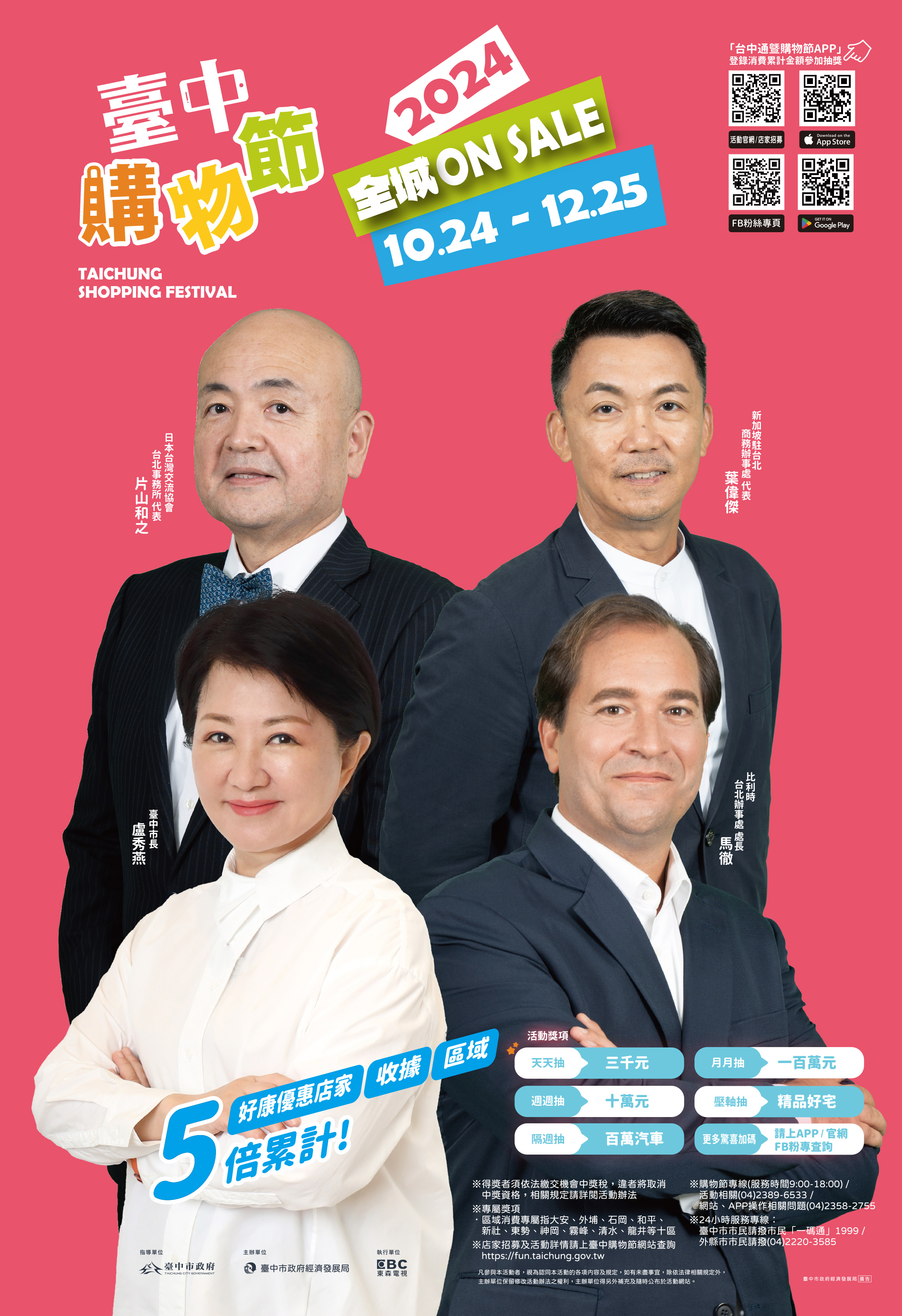 經發局補充,活動期間天天抽千份三千元、週週抽十萬共96名、隔週抽百萬汽車共4名、月月抽百萬共4名還有壓軸抽還有精品好宅,趕快消費、登錄活動APP,中獎機會愈高,歡迎年底安排台中之旅,活動詳情請查詢購物節臉書(https://www.facebook.com/shoppingtaichung/)、更多5倍好康優惠店家請查詢(https://fun.taichung.gov.tw/shop/index)。
