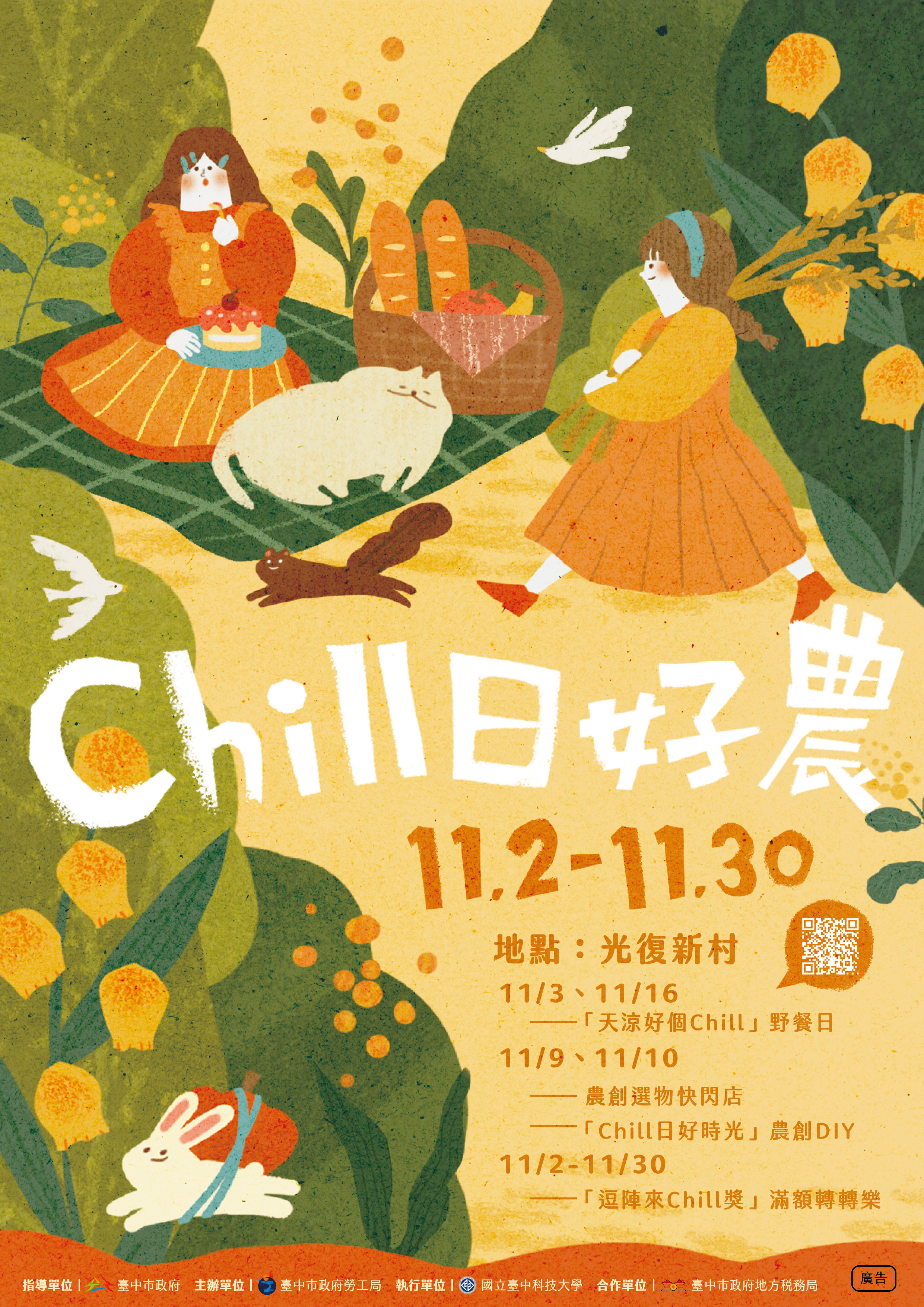 台中市政府勞工局為強化光復新村青創基地與霧峰在地連結,同時推展青年創業品牌,11月2日至11月30日將推出「Chill日好農」活動,特別集結基地青創品牌以台中市農產開發之「食品開發」及「生活工藝」等13項產品進行展出,並響應市民野餐日,舉辦「天涼好個Chill」野餐日,另活動期間還有農創選物快閃店、「Chill日好時光」農創DIY及「逗陣來Chill獎」滿額轉轉樂等活動,歡迎市民朋友攜家帶眷到訪一遊。