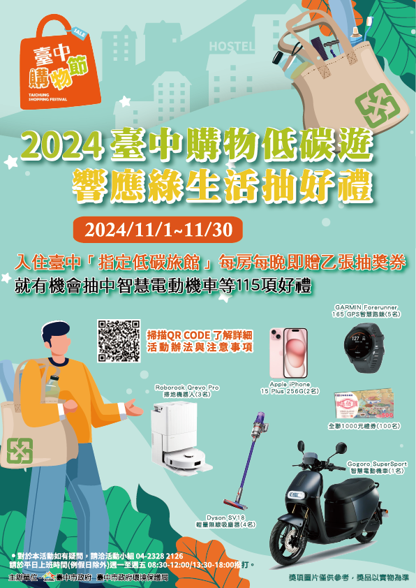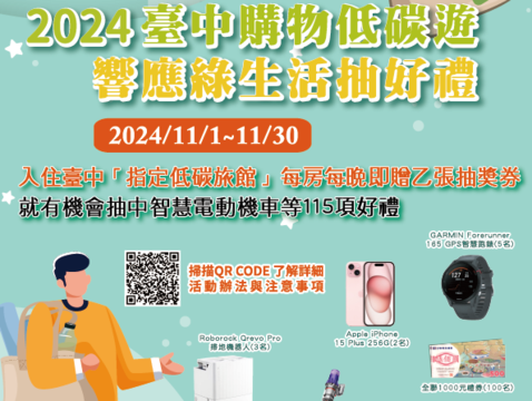為鼓勵民眾在台中住宿時能響應低碳旅遊,並自備個人衛生用品、以減少一次性垃圾產生,台中市政府環保局特別於2024台中購物節活動期間,結合台中市47家低碳旅館舉辦「2024台中購物低碳遊 響應綠生活抽好禮」活動。自11月1日起至30日,凡入住環保局指定的低碳旅館,就有機會抽中智慧電動機車及iPhone 15手機等大獎;此外,如入住之低碳旅館為台中購物節合作店家,還可登錄住宿發票參加台中購物節的抽獎活動。