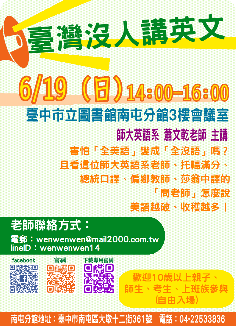 一.本(105)年6月19日(日)舉辦「台灣沒人講英文」專題講座,本講座邀請師大英語系蕭文乾老師分享如何藉由雙母語共學系統及其他學習外語之技巧,不用出國就能輕鬆跨越母語和外語的鴻溝,讓美語母語化,英文經典化。歡迎10歲以上親子、師生、考生、上班族參與。