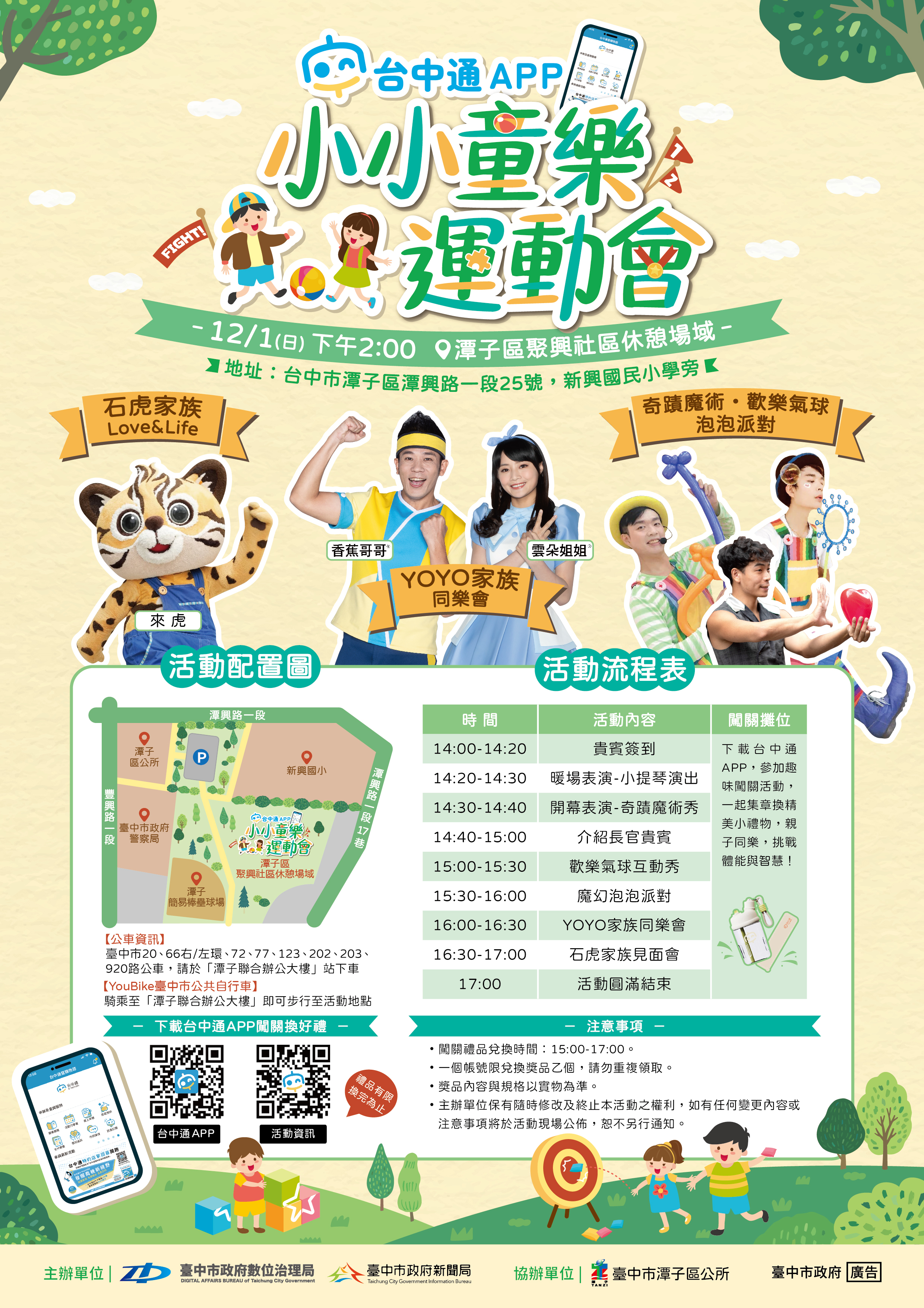 大小朋友都愛的親子闖關、YOYO家族及石虎家族來了!台中市政府數位治理局及新聞局攜手潭子區公所聯合舉辦「台中通APP─小小童樂運動會」,將於12月1日在潭子區聚興社區休憩場域歡樂登場;活動規劃有數位市民平台《台中通》數位集章闖關,完成闖關任務即可兌換限量精美好禮,歡迎民眾下載台中通APP,帶著孩子們一起度過歡樂親子時光!副市長鄭照新今(25)日出席宣傳記者會表示,此活動不僅是親子同樂運動會,更可讓市民認識《台中通》的多項服務,體驗「一機在手,市政服務就有」的便利生活。
