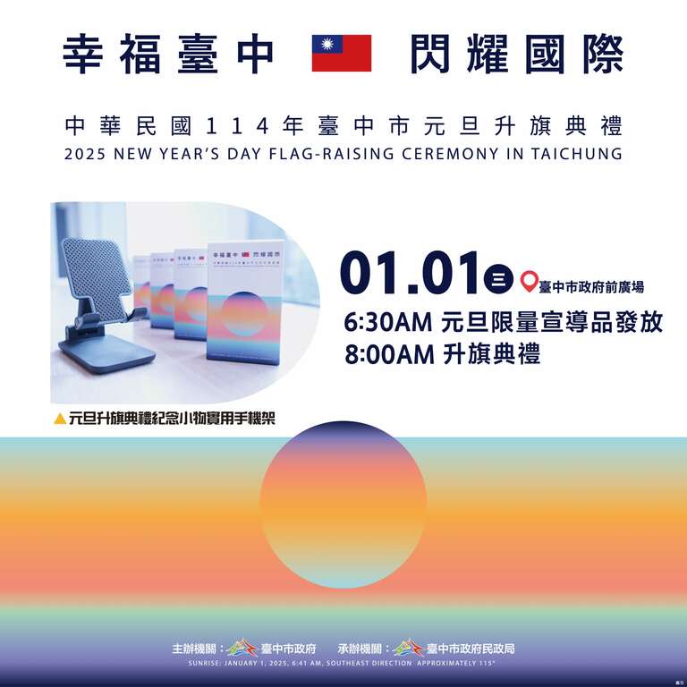 吳局長指出,114年元旦升旗典禮以「幸福台中、閃耀國際」為主題,活動主視覺透過晨曦初綻的意象,彰顯元旦升旗在新年伊始所象徵的信心與希望,整體色彩精選深具文化意涵與自然連結的色調,並以漸層方式呈現從沉穩到明亮的過渡,如同黎明微光自地平線徐徐擴散,散發新生與蓬勃躍動的氛圍,豐富的色彩語彙與深厚意境,期望市府在新的一年透過國際交流、產業升級與文化創新,不斷前行、綻放四方的美好願景。