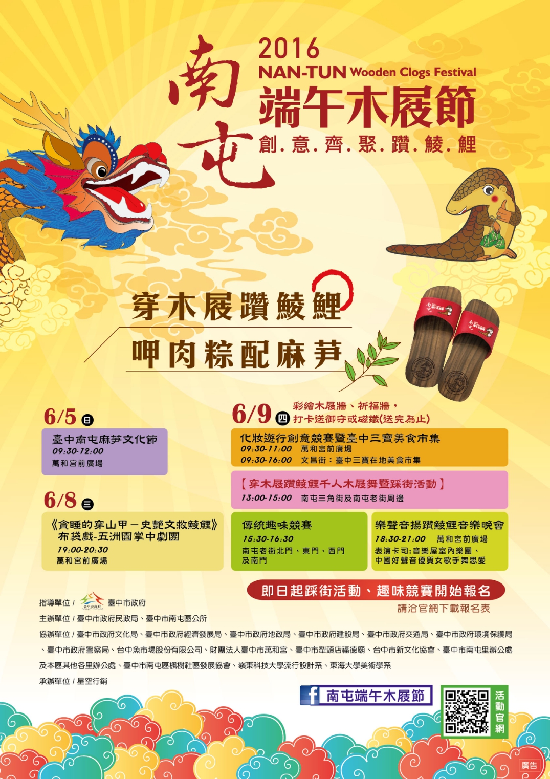 6月9日端午節當天上午10時,規劃麻芛湯與肉粽品嚐大會,下午1時則有千人跳木屐舞與踩街活動登場,邀請民眾共襄盛舉。活動詳情可至活動專頁(http://nantun2016.i-web.com.tw/ )或Facebook搜尋「南屯端午木屐節」查詢,或電洽南屯木屐節小組(04-23891458)。