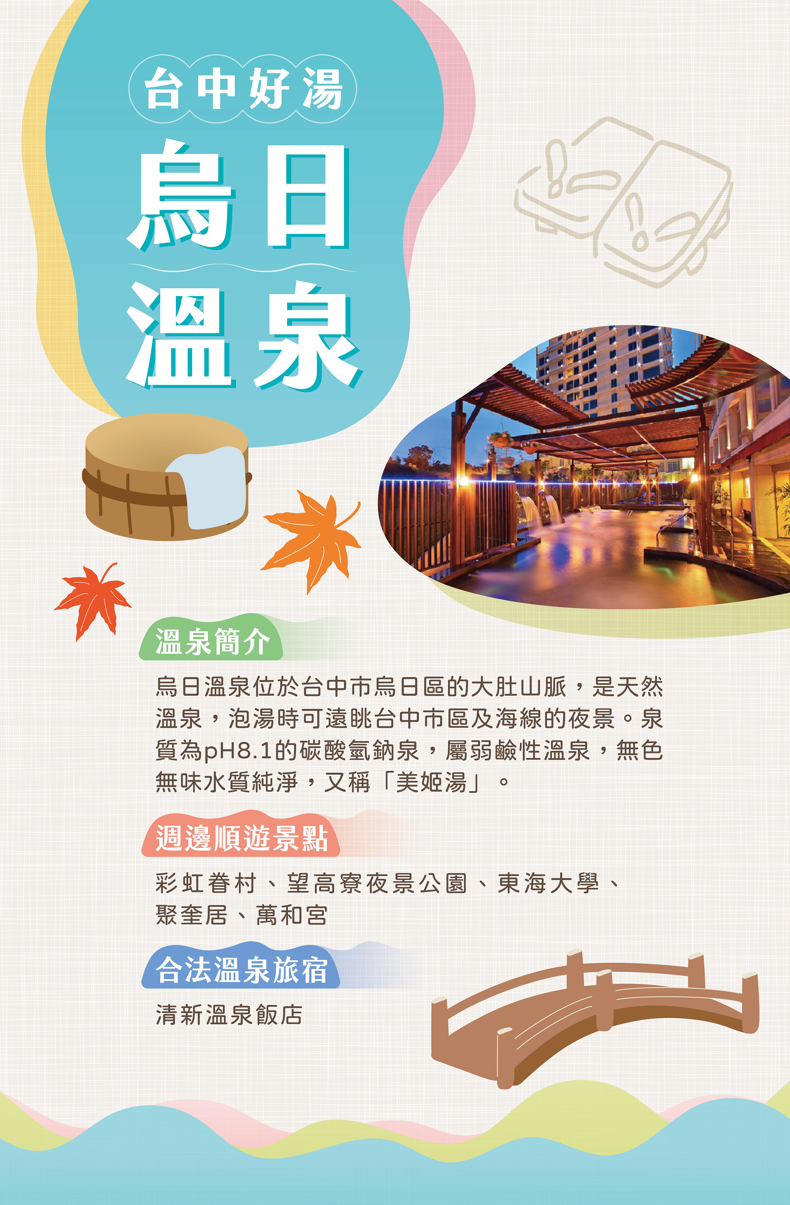 觀旅局長陳美秀表示,此次參加「金泉獎」票選活動的台中好湯,泉質屬於無色無味、清澈透明的碳酸氫鹽泉,各有各的風情與特色。位處原鄉的「谷關溫泉」坐擁山林美景,來此泡湯不僅能享受溫泉及芬多精的洗禮,還可體驗泰雅族原住民文化;而「大坑溫泉」位在大坑風景區內,富含微量元素等礦物質成分,對身體建康極有幫助,譽為「溫泉中的溫泉」;不可錯過的還有位於大肚山脈的「烏日溫泉」,泡湯時可遠眺台中市區及海線夜景,泡完之後皮膚還會有滑潤感,有「美肌湯」之稱。