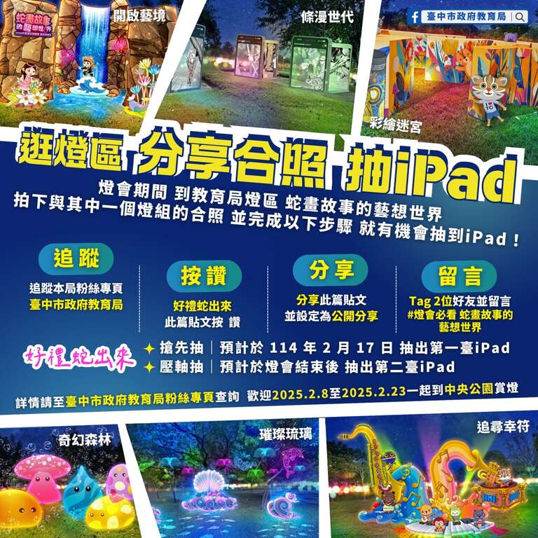 教育局表示,歡迎追蹤台中市政府教育局Facebook粉絲專頁,於燈會期間到「蛇畫故事」燈區拍照並留言分享,就有機會抽中平板,活動詳見: https://www.facebook.com/TaichungEducation 。遊客可下載中央公園導覽APP燈會特別版(IOS: https://reurl.cc/10dNRV ;Android: https://reurl.cc/6L1nAk ),輕鬆查詢各燈區位置,規劃最佳遊覽路線。燈會最新消息歡迎上台中觀光旅遊網( https://travel.taichung.gov.tw/ )查詢。
