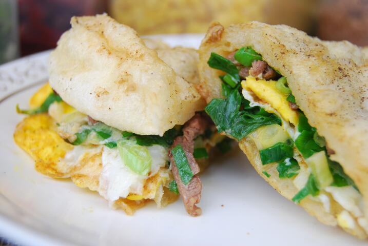 喜愛牛肉的朋友們,一定得嚐嚐牛肉燒!盧老闆嚴選頂級牛肉,切成牛肉條,嚐起來鮮嫩多汁,略有嚼勁,搭配手工餅皮,多層次的口感令人回味,特別是那鐵板現炒的牛肉,格外鮮香。