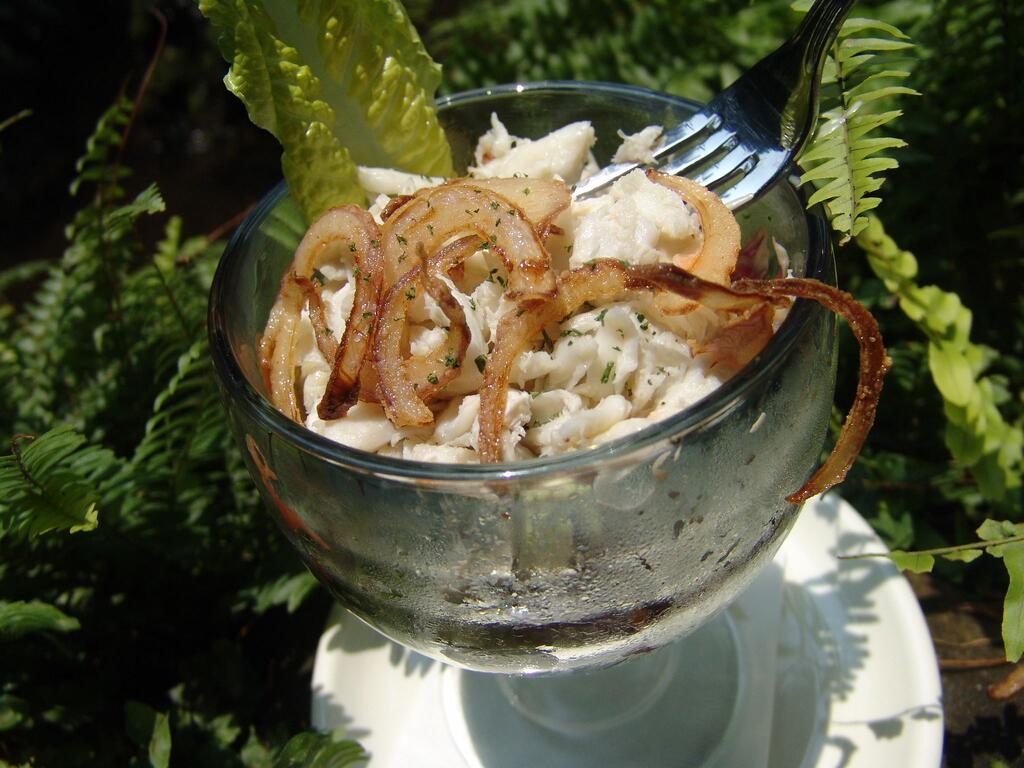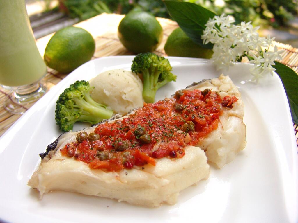 店家推薦的深海鱈魚佐酸豆醬,是以深海鱈魚為食材,肉質緊實,入口鮮甜。將鱈魚放入加進香料的高湯中煨煮,再放上自家做的酸豆醬,醃製蕃茄,酸豆與鯷魚凸顯出鱈魚本身鮮甜。不多加人工調味,光是自然甜味就令人回味。