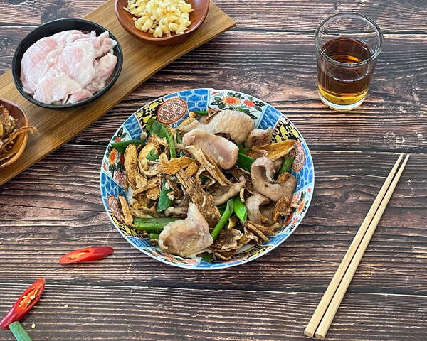 國產松阪豬彈牙,必吃薑片酥脆夠勁,椒鹽香料乾鍋拌炒。