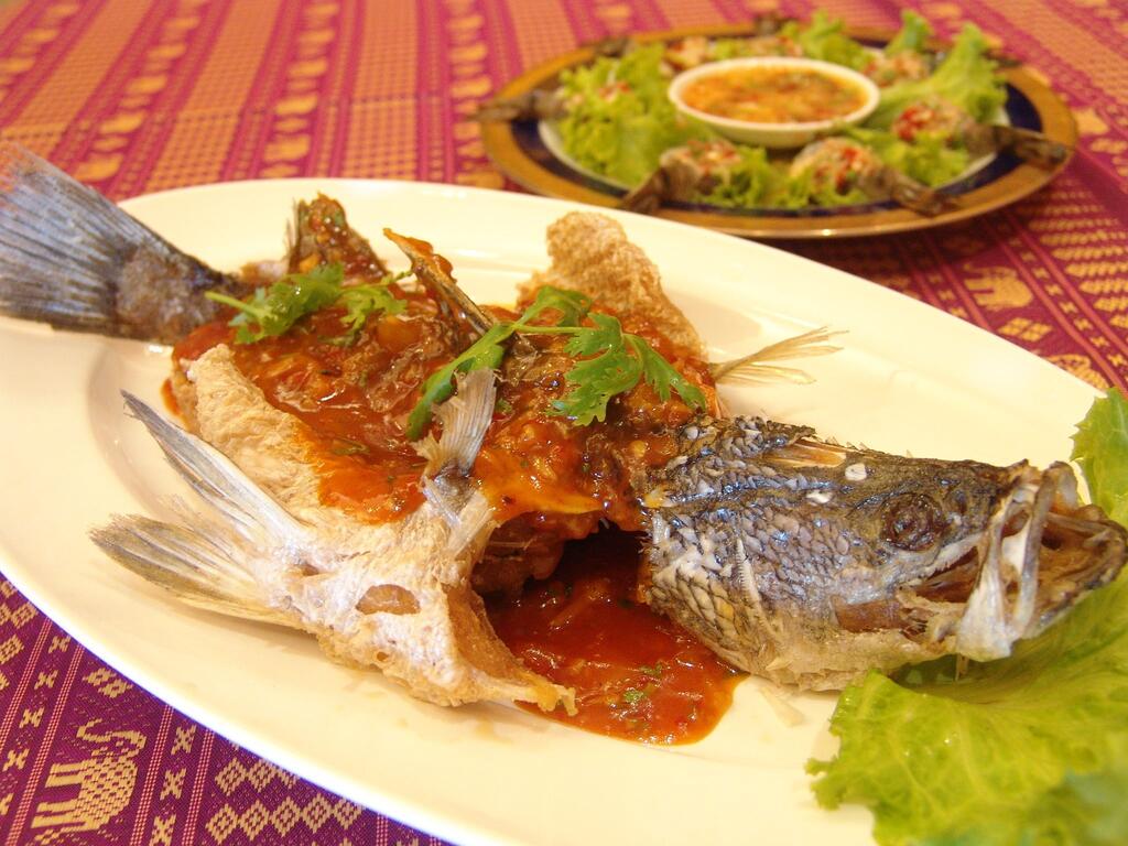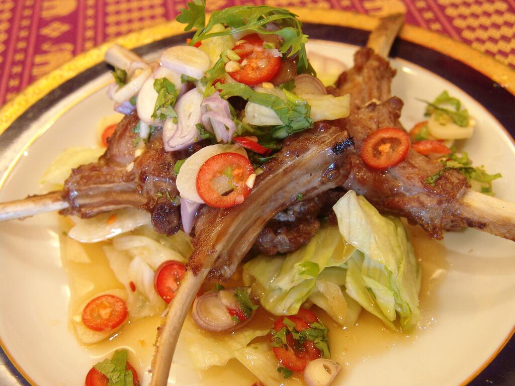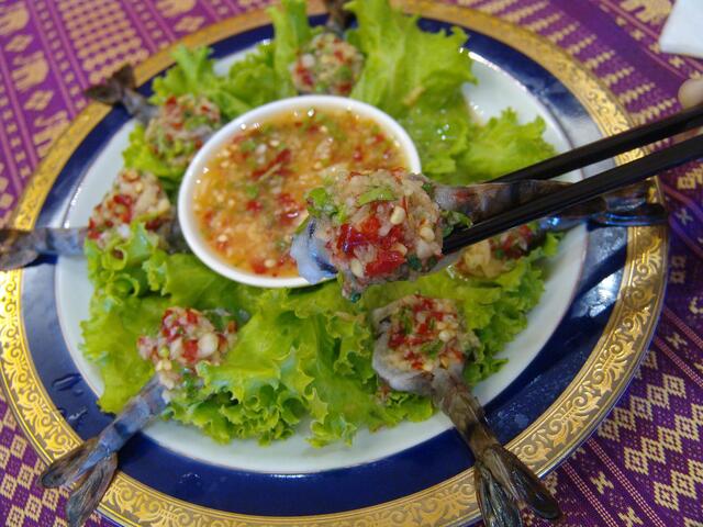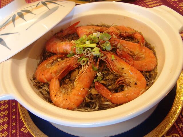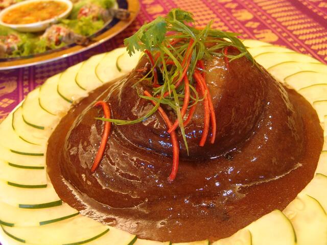 月亮蝦餅:用100%的新鮮蝦仁打成漿,絕對不加任何添加物,搭配特製紫蘇梅與泰國香料調配出來的沾醬,口感酥酥脆脆,鮮蝦的味道在口中散發出來,沾醬酸酸甜甜,口味非常獨特,有別於一般泰式料理的甜醬,厚度也是絕無僅有。