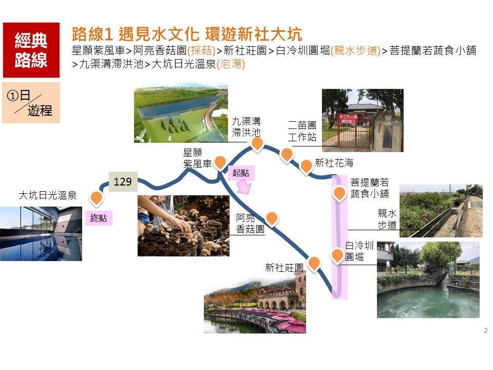 路線:星願紫風車→阿亮香菇園(採菇)→新社莊園→白冷圳圓堀(親水步道)→菩提蘭若蔬食小舖→九渠溝滯洪池→大坑日光溫泉(泡湯)